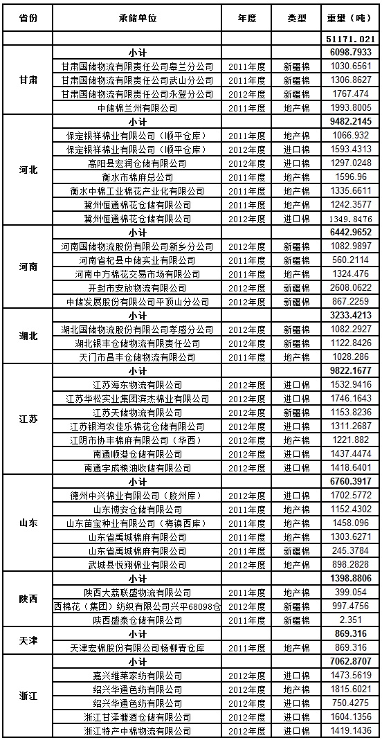 定于7月17日出庫銷售儲備棉51171.021噸。其中2012年度國產(chǎn)棉14617.9532噸(最低起拍價12790元/噸,捆號47500112513),2012年度進口棉18636.6116噸(最低起拍價13980元/噸,捆號分別為31450112021和31420012037);2011年度國產(chǎn)棉17916.4562噸(最低起拍價10670元/噸,捆號30000211314)。相關(guān)批次公檢數(shù)據(jù)見附件。具體庫點如下: