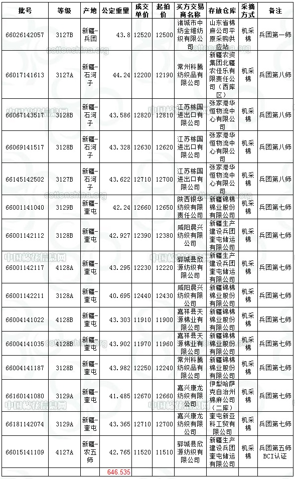 7月17日新疆棉競賣交易兵團專場推出資源量為20017.2024噸,實際成交646.535噸,成交率3.23%,成交均價12375元/噸,平均長度28.5。