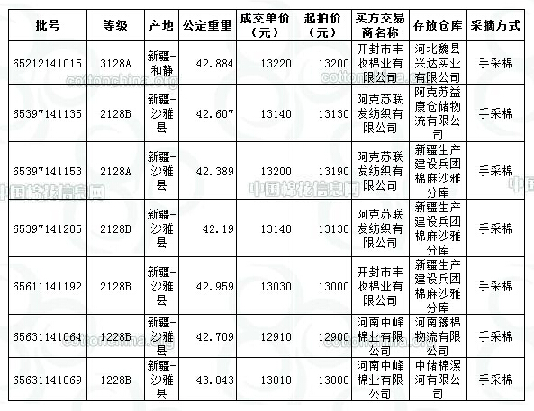 當(dāng)日成交資源7批。其中4批存放在新疆庫(kù)(手采棉),3批存放在內(nèi)地庫(kù)(手摘棉);最高加價(jià)30元/噸成交。