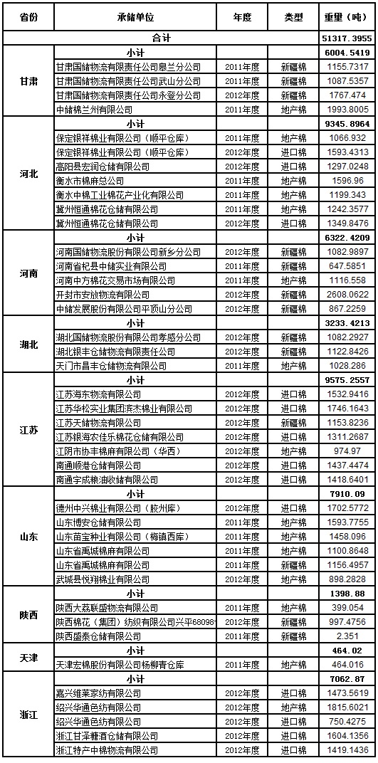 定于7月21日出庫(kù)銷(xiāo)售儲(chǔ)備棉51317.4噸。其中2012年度國(guó)產(chǎn)棉14371.0412噸(最低起拍價(jià)12790元/噸,捆號(hào)47500112513),2012年度進(jìn)口棉18636.6116噸(最低起拍價(jià)13980元/噸,捆號(hào)分別為31450112021和31420012037);2011年度國(guó)產(chǎn)棉18309.7427噸(最低起拍價(jià)10780元/噸,捆號(hào)30000211325)。相關(guān)批次公檢數(shù)據(jù)見(jiàn)附件。具體庫(kù)點(diǎn)如下:
