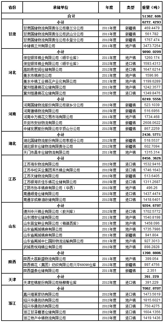 定于7月29日出庫銷售儲備棉51362.6055噸。其中2012年度國產棉12125.0857噸(最低起拍價12790元/噸,捆號47500112513),2012年度進口棉19378.4372噸(最低起拍價13800元/噸,捆號分別為30000212102);2011年度國產棉19859.0826噸(最低起拍價11710元/噸,捆號07100211306)。相關批次公檢數據見附件。具體庫點如下: