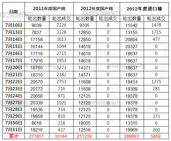7月31日儲(chǔ)備棉輪出數(shù)量為51701.3324噸,實(shí)際成交697.0477噸,成交比例1.35%。參與涉及競(jìng)買成功的企業(yè)共計(jì)3家。據(jù)中國(guó)棉花信息網(wǎng)統(tǒng)計(jì),截至7月31日儲(chǔ)備棉輪出累計(jì)成交39001.9634噸,成交比例4.98%。