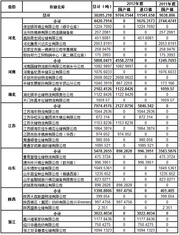定于7月10日出庫銷售儲備棉30285.2182噸。其中2012年度國產(chǎn)棉9704.7544噸,2012年度進口棉11541.6578噸;2011年度國產(chǎn)棉9038.806噸。相關批次公檢數(shù)據(jù)見附件。具體庫點如下: