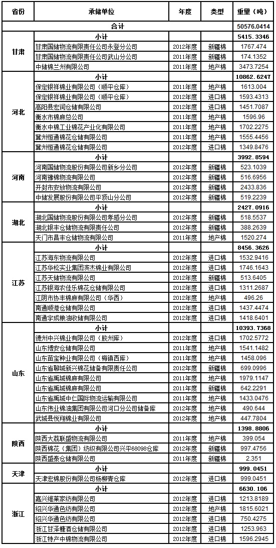 定于8月10日出庫銷售儲備棉50576.0414噸。其中2012年度國產(chǎn)棉12127.6532噸(最低起拍價12790元/噸,捆號47500112513),2012年度進口棉19357.5759噸(最低起拍價13560元/噸,捆號分別為30000212104);2011年度國產(chǎn)棉19090.8123噸(最低起拍價11600元/噸,捆號43170011462)。相關(guān)批次公檢數(shù)據(jù)見附件。具體庫點如下: