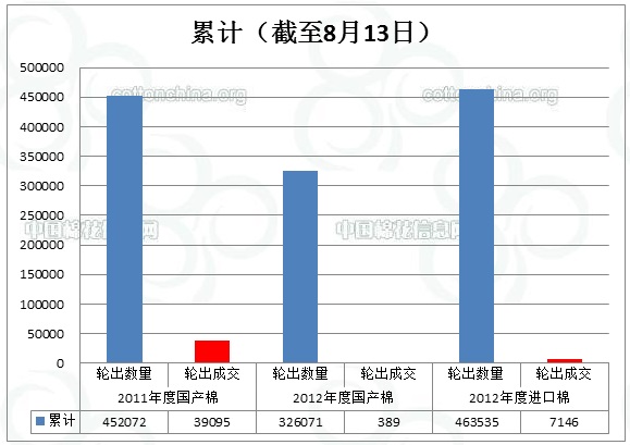 8月13日儲(chǔ)備棉輪出數(shù)量為50880.7408噸,實(shí)際成交858.2226噸,成交比例1.69%。參與涉及競(jìng)買成功的企業(yè)共計(jì)4家。據(jù)中國棉花信息網(wǎng)統(tǒng)計(jì),截至8月13日儲(chǔ)備棉輪出累計(jì)成交46628.1578噸,成交比例3.76%。