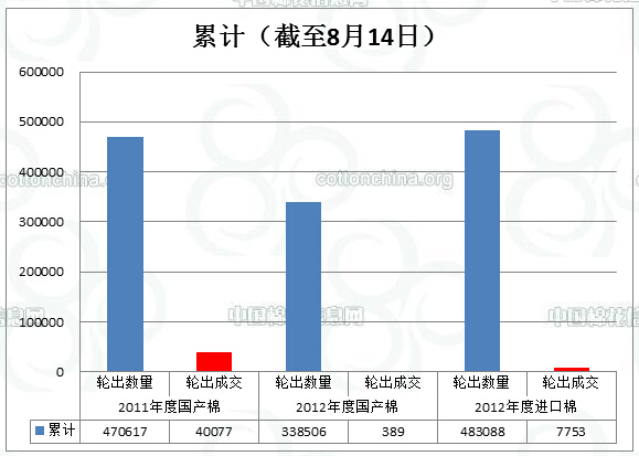 8月14日儲(chǔ)備棉輪出數(shù)量為50533.5024噸,實(shí)際成交1589.3934噸,成交比例3.15%。參與涉及競(jìng)買成功的企業(yè)共計(jì)5家。據(jù)中國(guó)棉花信息網(wǎng)統(tǒng)計(jì),截至8月14日儲(chǔ)備棉輪出累計(jì)成交48217.5512噸,成交比例3.73%。