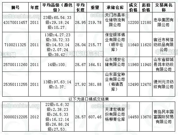 2012年度進(jìn)口棉成交價(jià):14450元/噸,折3128B價(jià)16280元/噸。平均長(zhǎng)度28.6。