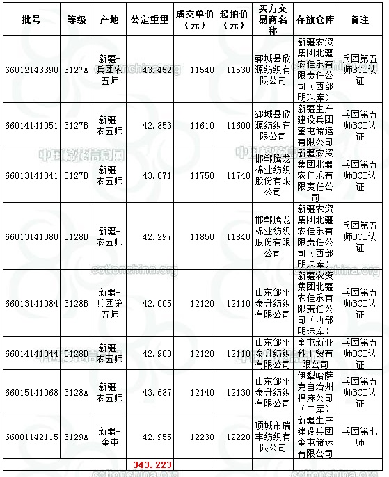 8月14日兵團棉競賣交易成交結(jié)果