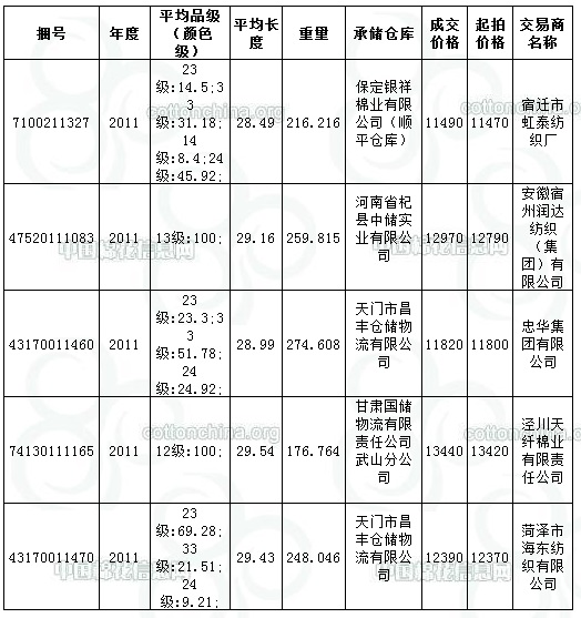 2011年度國(guó)產(chǎn)棉最高成交價(jià):13440元/噸,最低成交價(jià):11490元/噸,平均成交價(jià):12422元/噸,折3128B價(jià)13252元/噸。平均長(zhǎng)度29.1。