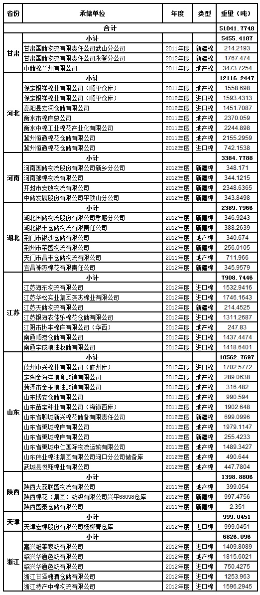 定于8月21日出庫(kù)銷售儲(chǔ)備棉51041.7748噸。其中2012年度國(guó)產(chǎn)棉12348.5134噸(最低起拍價(jià)12790元/噸,捆號(hào)47500112513),2012年度進(jìn)口棉18945.8721噸(最低起拍價(jià)13560元/噸,捆號(hào)分別為30000212104);2011年度國(guó)產(chǎn)棉19925.5936噸(最低起拍價(jià)11660元/噸,捆05300311364)。相關(guān)批次公檢數(shù)據(jù)見附件。具體庫(kù)點(diǎn)如下: