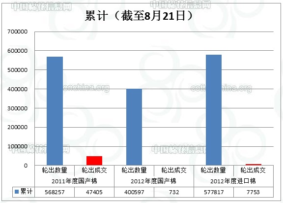 8月21日儲備棉輪出數(shù)量為51041.7748噸,實(shí)際成交1282.6513噸,當(dāng)日成交比例2.51%。參與涉及競買成功的企業(yè)共計(jì)5家。據(jù)中國棉花信息網(wǎng)統(tǒng)計(jì),截至8月21日儲備棉輪出累計(jì)成交55888.5438噸,成交比例3.61%。