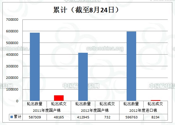 8月24日儲(chǔ)備棉輪出數(shù)量為50525.0076噸,實(shí)際成交1241.1178噸,成交比例2.46%。參與涉及競買成功的企業(yè)共計(jì)6家。據(jù)中國棉花信息網(wǎng)統(tǒng)計(jì),截至8月24日儲(chǔ)備棉輪出累計(jì)成交57129.6616噸,成交比例2.17。