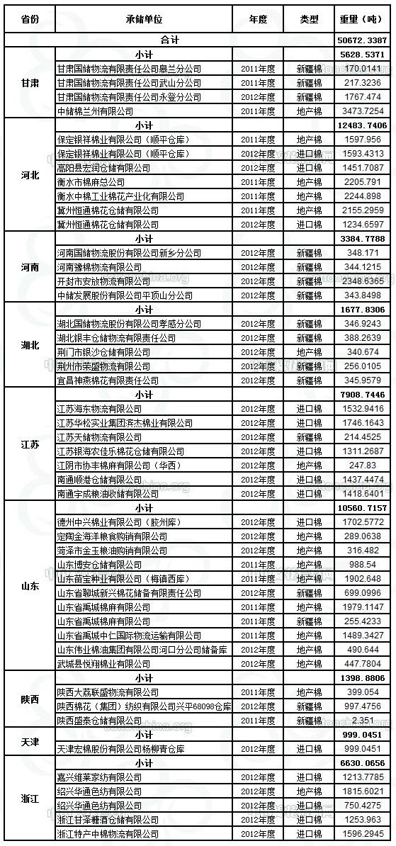 定于8月25日出庫(kù)銷售儲(chǔ)備棉50672.3387噸。其中2012年度國(guó)產(chǎn)棉12348.5134噸(最低起拍價(jià)12790元/噸,捆號(hào)47500112513),2012年度進(jìn)口棉19242.3476噸(最低起拍價(jià)13560元/噸,捆號(hào)分別為30000212104);2011年度國(guó)產(chǎn)棉19081.4777噸(最低起拍價(jià)11660元/噸,捆05300311364)。相關(guān)批次公檢數(shù)據(jù)見附件。具體庫(kù)點(diǎn)如下: