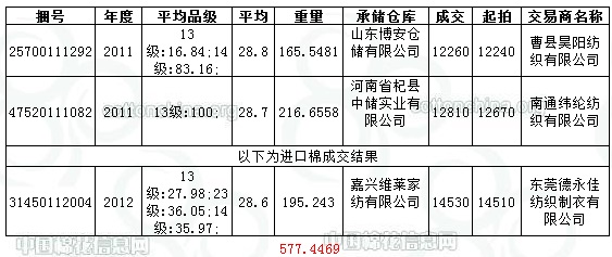 8月26日儲(chǔ)備輪出成交577.4469噸,其中2011年度國產(chǎn)棉382.2039噸,2012年度進(jìn)口棉195.243噸。