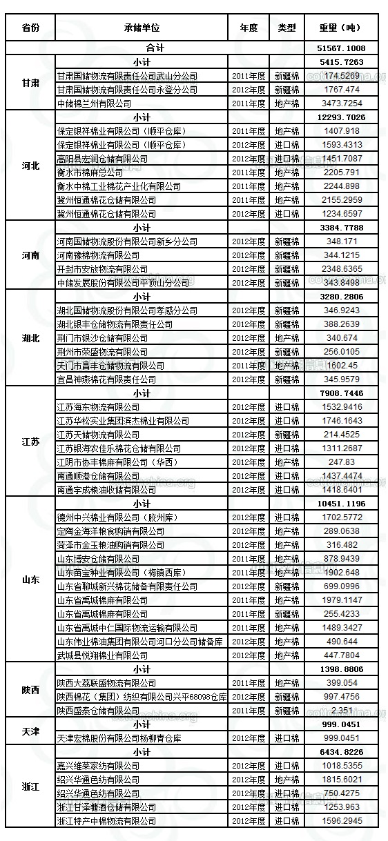 定于8月27日出庫銷售儲備棉51567.1008噸。其中2012年度國產(chǎn)棉12348.5134噸(最低起拍價12790元/噸,捆號47500112513),2012年度進(jìn)口棉19047.1046噸(最低起拍價13560元/噸,捆號分別為30000212104);2011年度國產(chǎn)棉20171.4828噸(最低起拍價11660元/噸,捆05300311364)。相關(guān)批次公檢數(shù)據(jù)見附件。具體庫點(diǎn)如下: