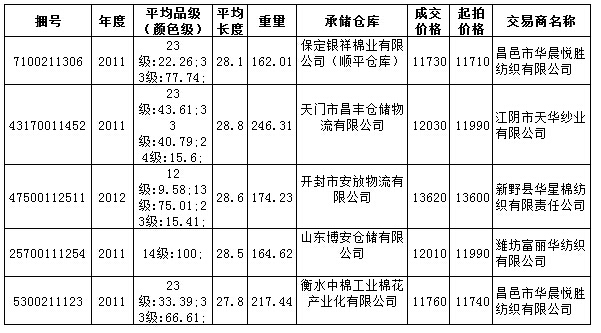 一、最高成交價(jià)13620元/噸,共計(jì)174.2262噸,承儲(chǔ)在開封市安放物流有限公司(2012年度國(guó)產(chǎn)棉)。最低成交價(jià)11730元/噸,共計(jì)162.0120噸,承儲(chǔ)在保定銀祥棉業(yè)有限公司(順平倉庫)(2011年度國(guó)產(chǎn)棉)。