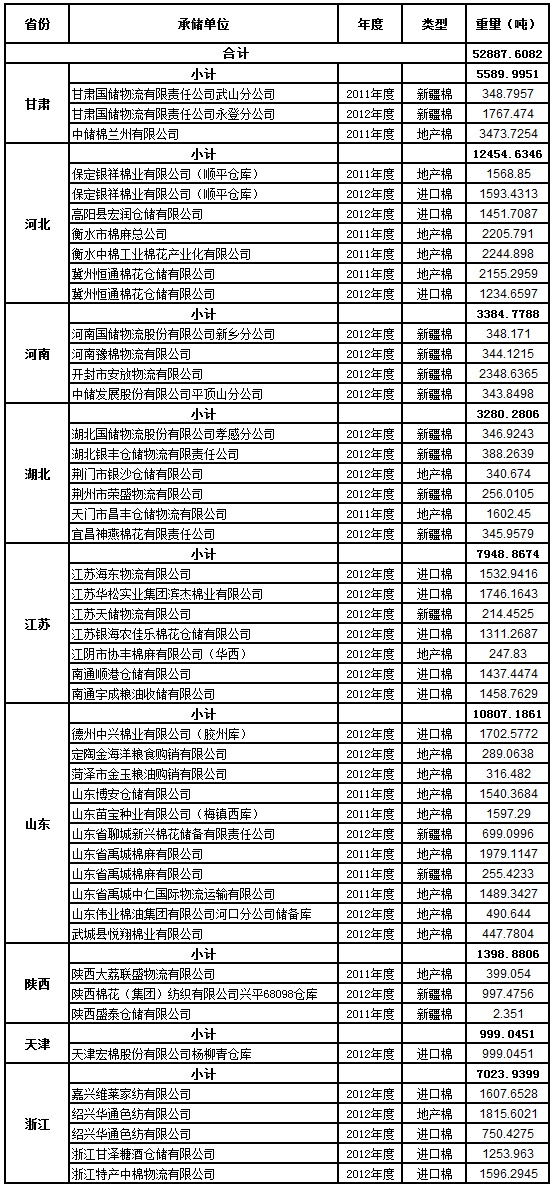 定于8月31日出庫(kù)銷售儲(chǔ)備棉52887.6082噸。其中2012年度國(guó)產(chǎn)棉12348.5134噸(最低起拍價(jià)12790元/噸,捆號(hào)47500112513),2012年度進(jìn)口棉19676.3447噸(最低起拍價(jià)13560元/噸,捆號(hào)分別為30000212104);2011年度國(guó)產(chǎn)棉20862.7501噸(最低起拍價(jià)11660元/噸,捆05300311364)。相關(guān)批次公檢數(shù)據(jù)見附件。具體庫(kù)點(diǎn)如下: