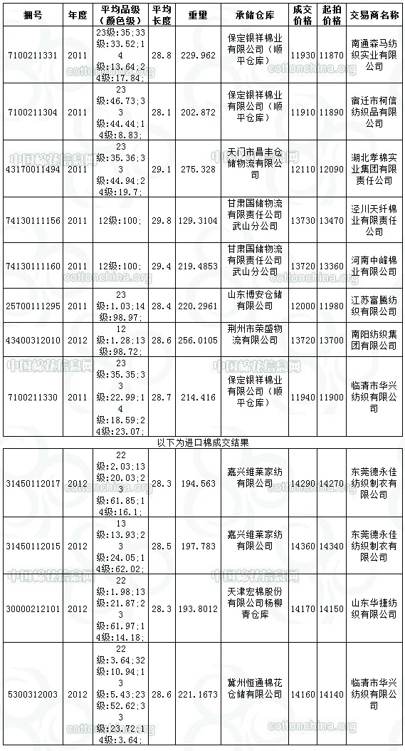 8月31日儲(chǔ)備輪出成交2554.9948噸,2011年度國(guó)產(chǎn)棉1491.6698噸,2012年度國(guó)產(chǎn)棉256.0105噸,2012年度進(jìn)口棉807.3145噸。