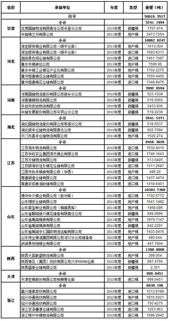 定于8月6日出庫銷售儲備棉50616.3517噸。其中2012年度國產(chǎn)棉12342.0987噸(最低起拍價12790元/噸,捆號47500112513),2012年度進口棉19357.5759噸(最低起拍價13560元/噸,捆號分別為30000212104);2011年度國產(chǎn)棉18916.6771噸(最低起拍價11600元/噸,捆號43170011462)。相關(guān)批次公檢數(shù)據(jù)見附件。具體庫點如下: