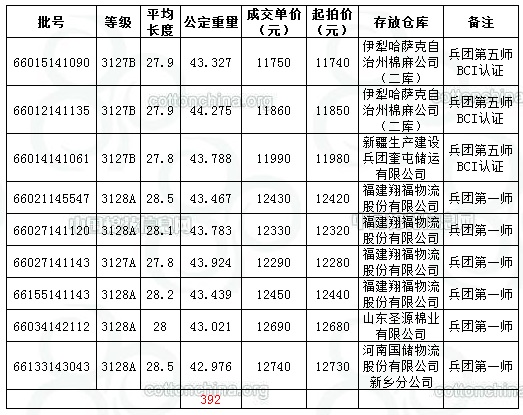 9月16日新疆棉競賣交易兵團專場推出資源量為18652.61噸,實際成交392噸,成交率2.1%,最高成交價12740元/噸,最低成交價11750元/噸,成交均價12281.11元/噸,平均長度28.08。中國棉花信息網統(tǒng)計,截至9月16日,兵團已累計成交資源32691.544噸。