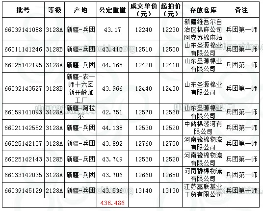 今日全部為兵團(tuán)第一師成交436.486噸,占當(dāng)日該師上市資源量的2.10%。
