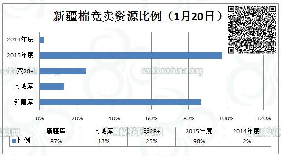 全國棉花交易市場定于1月20日上市新疆棉競賣資源3871.491噸(均為2015年度資源),最低起拍價11800元/噸。其中新疆庫區(qū)資源3353.82噸,內(nèi)地庫區(qū)資源僅517.671噸。其中雙28+資源占969.714噸。