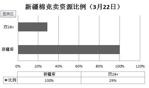 全國棉花交易市場定于3月22日上市新疆棉競賣資源2515.622噸,全部為新疆手摘棉,最低起拍價11350元/噸。其中存儲在新疆倉庫2257.689噸,全部為2015年度棉花,最低起報價11350元/噸,最高13000元/噸;存儲在江蘇連云港172.459噸,為2015年度棉花,起報價全部為13150元/噸,存儲在山東平原85.474噸,為2014年度棉花,起報價為13270元/噸。該日推出的資源中雙28+資源占728.849噸。