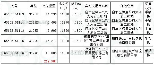 4月13日新疆棉競賣交易推出資源量為2007.464噸,實(shí)際成交219.907噸,成交比例10.95%;最高價(jià)11920元/噸,最低價(jià)11360元/噸,成交均價(jià)為11766元/噸,平均長度28.66。
