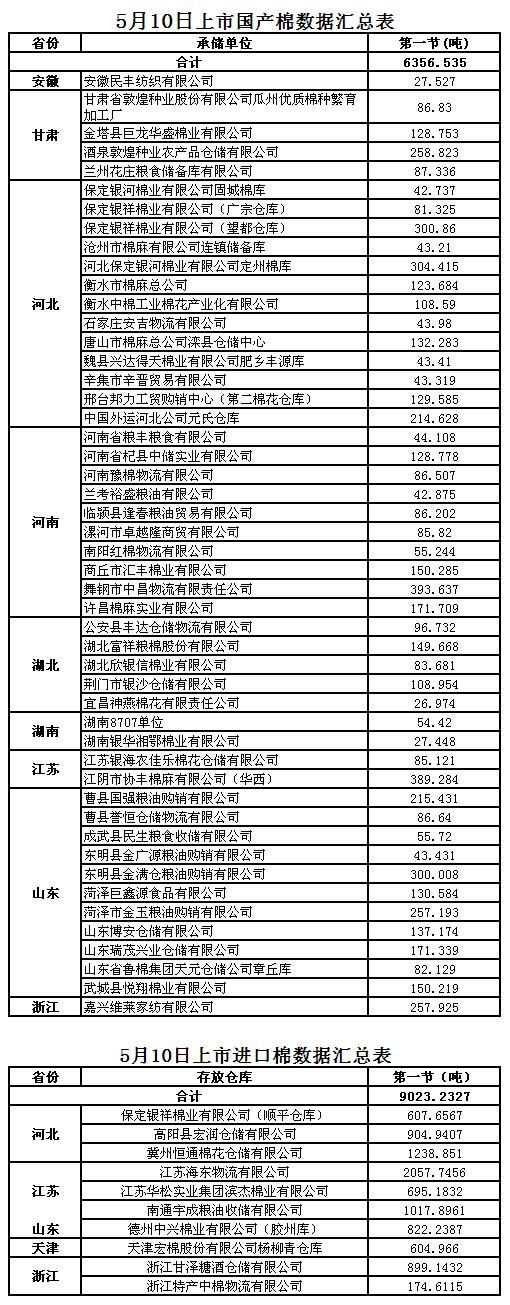 定于5月10日第一節(jié)出庫銷售儲(chǔ)備棉15379.7677噸,其中國產(chǎn)棉6356.535噸,進(jìn)口棉9023.2327噸。相關(guān)批次公檢數(shù)據(jù)見附件。具體庫點(diǎn)如下: