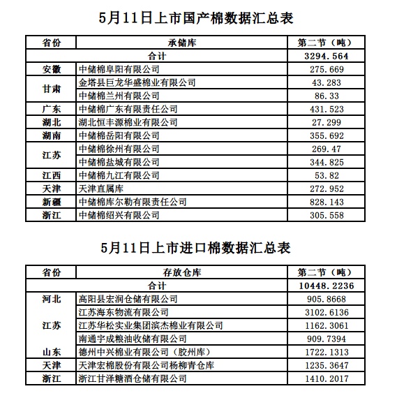 定于5月11日第二節(jié)出庫(kù)銷售儲(chǔ)備棉13742.7876噸,其中國(guó)產(chǎn)棉3294.5640噸,進(jìn)口棉10448.2236噸。相關(guān)批次公檢數(shù)據(jù)見附件。具體庫(kù)點(diǎn)如下: