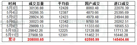 儲(chǔ)備棉出庫銷售資源28092.394噸,實(shí)際成交27908.589噸,成交率達(dá)到99.35%,成交均價(jià)12301元/噸。當(dāng)日最高價(jià)13890元/噸(進(jìn)口棉),最低價(jià)10320元/噸(國(guó)產(chǎn)棉)。據(jù)中國(guó)棉花信息網(wǎng)統(tǒng)計(jì),截至5月11日,儲(chǔ)備棉輪出累計(jì)成交208000.6499噸,其中進(jìn)口棉成交145404.6611噸,成交率100%,國(guó)產(chǎn)棉成交62595.9888噸,成交率97.49%。