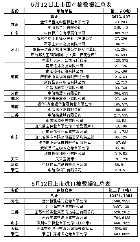 定于5月12日第二節(jié)出庫銷售儲備棉16104.6074噸,其中國產(chǎn)棉3672.907噸,進(jìn)口棉12431.7004噸。相關(guān)批次公檢數(shù)據(jù)見附件。具體庫點(diǎn)如下: