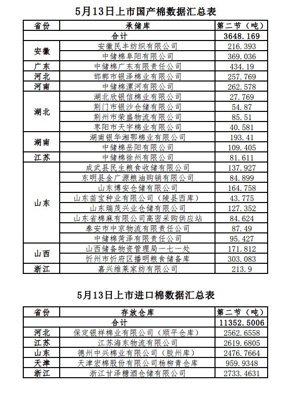 定于5月13日第二節(jié)出庫銷售儲(chǔ)備棉15000.6696噸,其中國產(chǎn)棉3648.169噸,進(jìn)口棉11352.5006噸。相關(guān)批次公檢數(shù)據(jù)見附件。具體庫點(diǎn)如下: