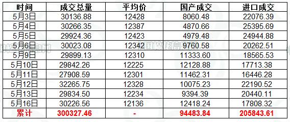 5月16日儲(chǔ)備棉出庫(kù)銷售資源30226.5606噸,實(shí)際成交30226.5606噸,成交率100%,成交均價(jià)12136元/噸。當(dāng)日最高價(jià)12980元/噸(進(jìn)口棉),最低價(jià)10770元/噸(國(guó)產(chǎn)棉)。據(jù)中國(guó)棉花信息網(wǎng)統(tǒng)計(jì),截至5月16日,儲(chǔ)備棉輪出累計(jì)成交300327.4566噸,進(jìn)口棉成交總量:205843.6138噸,成交率:100.00%。國(guó)產(chǎn)棉成交總量:94483.8428噸,成交率:97.79%。