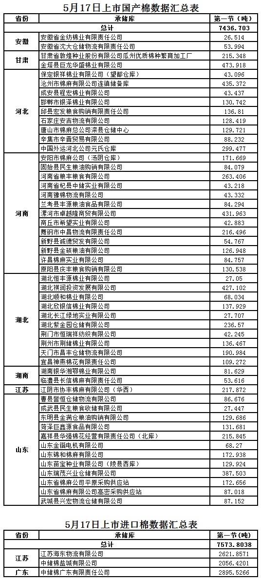 定于5月17日第一節(jié)出庫銷售儲備棉15010.5068噸,其中國產(chǎn)棉7436.7030噸,進(jìn)口棉7573.8038噸。相關(guān)批次公檢數(shù)據(jù)見附件。具體庫點如下: