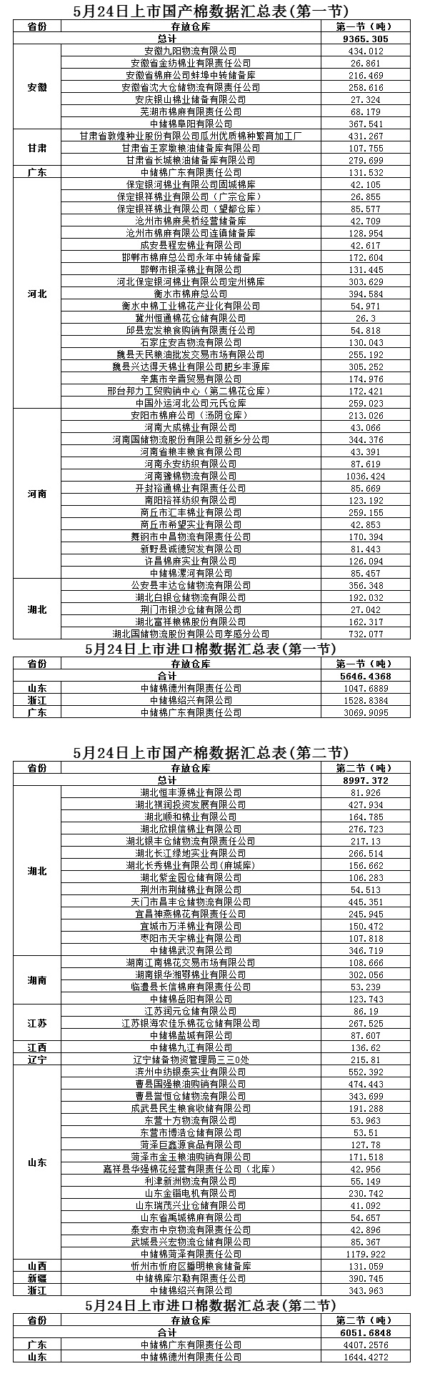 定于5月24日第一節(jié)銷售儲(chǔ)備棉15011.7418噸,其中國產(chǎn)棉9365.3050噸,進(jìn)口棉5646.4368噸。第二節(jié)銷售儲(chǔ)備棉15049.0568噸,其中國產(chǎn)棉8997.3720噸,進(jìn)口棉6051.6848噸。相關(guān)批次公檢數(shù)據(jù)見附件。具體庫點(diǎn)如下。