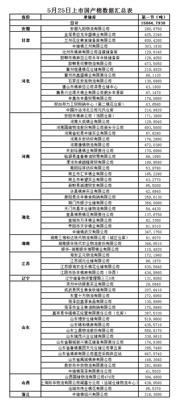 定于5月25日第一節(jié)銷售儲(chǔ)備棉15064.7930噸,其中國(guó)產(chǎn)棉15064.7930噸,進(jìn)口棉0噸,相關(guān)批次公檢數(shù)據(jù)見附件。具體庫點(diǎn)如下。