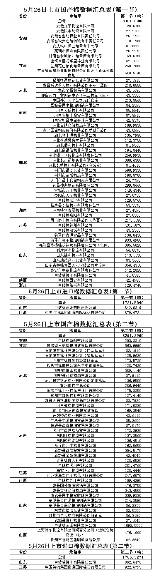 定于5月26日第一節(jié)銷售儲(chǔ)備棉10022.594噸,其中國產(chǎn)棉8301.0900噸、進(jìn)口棉1721.5040噸。第二節(jié)銷售儲(chǔ)備棉10076.6231噸,其中國產(chǎn)棉8291.2960噸、進(jìn)口棉1785.3271噸。相關(guān)批次公檢數(shù)據(jù)見附件。具體庫點(diǎn)如下: