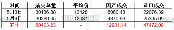 5月4日儲備棉輪出出庫銷售資源30393.76噸,實(shí)際成交30266.35噸,成交率達(dá)到99.58%,成交均價12387元/噸。當(dāng)日最高價13230元/噸(進(jìn)口棉),最低價10410元/噸(國產(chǎn)棉)。據(jù)統(tǒng)計(jì),截至5月4日,儲備棉輪出累計(jì)成交60403.22噸,其中進(jìn)口棉成交47472.08噸,成交率100%,國產(chǎn)棉成交12931.14噸,成交率97.49%。
