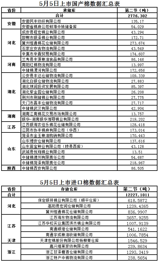 定于5月5日第二節(jié)出庫銷售儲備棉15003.4031噸;其中國產(chǎn)棉2776.3020噸,進口棉12227.1011噸。相關(guān)批次公檢數(shù)據(jù)見附件。具體庫點如下: