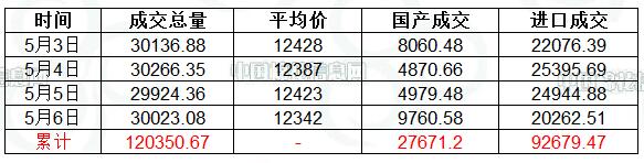 5月6日儲(chǔ)備棉輪出出庫(kù)銷售資源30368.9096噸,實(shí)際成交30023.0846噸,成交率達(dá)到98.86%,成交均價(jià)12342元/噸。當(dāng)日最高價(jià)12920元/噸(國(guó)產(chǎn)棉),最低價(jià)10890元/噸(國(guó)產(chǎn)棉)。據(jù)中國(guó)棉花信息網(wǎng)統(tǒng)計(jì),截至5月6日,儲(chǔ)備棉輪出累計(jì)成交120350.6671噸,其中進(jìn)口棉成交92679.4689噸,成交率100%,國(guó)產(chǎn)棉成交27671.1982噸,成交率97.16%。