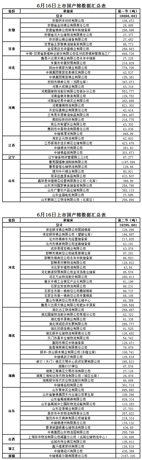6月16日兩節(jié)共計輪出儲備棉20960.244噸。第一節(jié)計劃輪出儲備棉10664.643噸,其中國產棉10664.643噸、進口棉0噸。第二節(jié)計劃輪出儲備棉10295.601噸,其中國產棉10295.601噸、進口棉0噸。