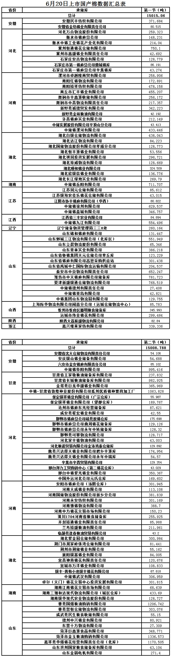 6月20日兩節(jié)共計(jì)輪出儲(chǔ)備棉30023.848噸。第一節(jié)計(jì)劃輪出儲(chǔ)備棉15015.0600噸,其中國(guó)產(chǎn)棉15015.0600噸、進(jìn)口棉0噸。第二節(jié)計(jì)劃輪出儲(chǔ)備棉15008.7880噸,其中國(guó)產(chǎn)棉15008.7880噸、進(jìn)口棉0噸。