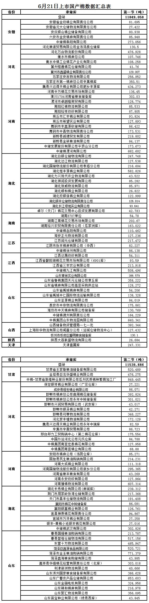 6月21日兩節(jié)共計(jì)輪出儲(chǔ)備棉23388.944噸。第一節(jié)計(jì)劃輪出儲(chǔ)備棉11849.0580噸,其中國(guó)產(chǎn)棉11849.0580噸、進(jìn)口棉0噸。第二節(jié)計(jì)劃輪出儲(chǔ)備棉11539.8860噸,其中國(guó)產(chǎn)棉11539.8860噸、進(jìn)口棉0噸。
