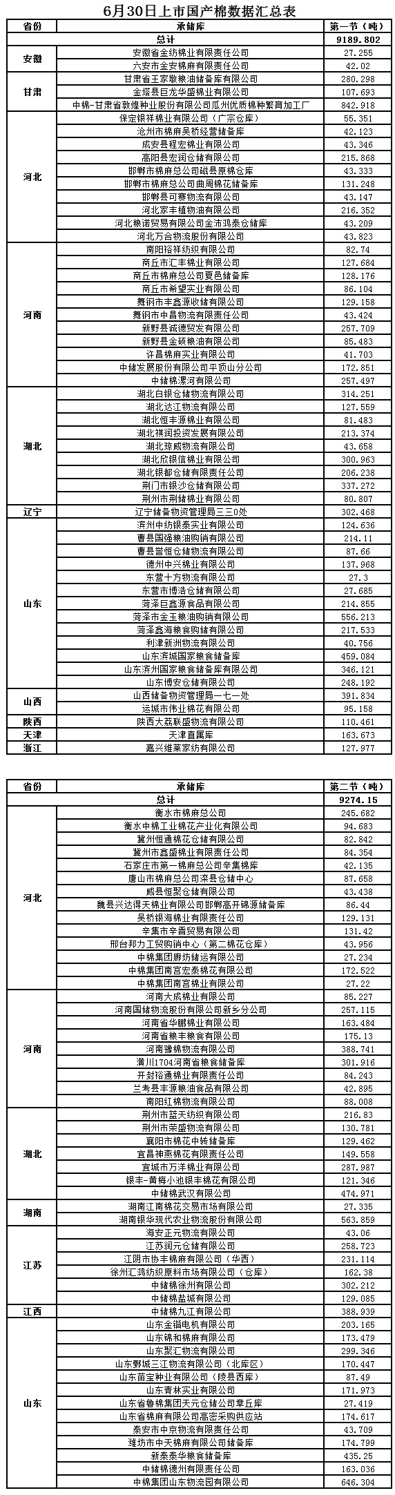 6月30日兩節(jié)共計輪出儲備棉18463.952噸。第一節(jié)計劃輪出儲備棉9189.8020噸,其中國產(chǎn)棉9189.8020噸、進口棉0噸。第二節(jié)計劃輪出儲備棉9274.1500噸,其中國產(chǎn)棉9274.1500噸、進口棉0噸。