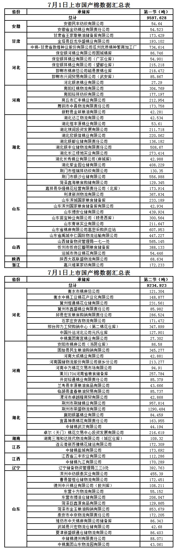 7月1日兩節(jié)共計輪出儲備棉18832.5510噸。第一節(jié)銷售儲備棉9597.6280噸,其中國產(chǎn)棉9597.6280噸、進口棉0噸。第二節(jié)銷售儲備棉9234.9230噸,其中國產(chǎn)棉9234.9230噸、進口棉0噸。
