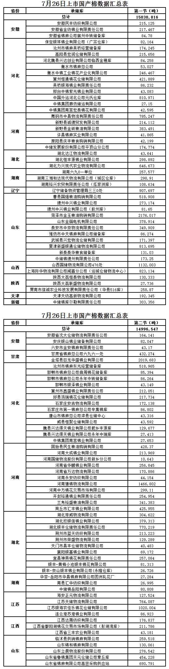 7月26日兩節(jié)共計(jì)輪出儲備棉30027.363噸。第一節(jié)計(jì)劃輪出儲備棉15030.8160噸,其中國產(chǎn)棉15030.8160噸、進(jìn)口棉0噸。第二節(jié)計(jì)劃輪出儲備棉14996.5470噸,其中國產(chǎn)棉14996.5470噸、進(jìn)口棉0噸。