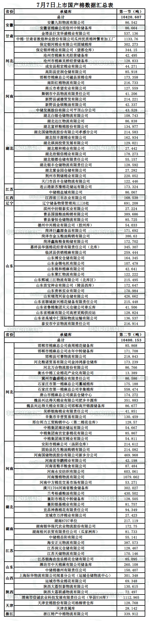 7月7日兩節(jié)共計(jì)輪出儲(chǔ)備棉20820.7600噸。第一節(jié)計(jì)劃輪出儲(chǔ)備棉10420.6070噸,其中國產(chǎn)棉10420.6070噸、進(jìn)口棉0噸。第二節(jié)計(jì)劃輪出儲(chǔ)備棉10400.1530噸,其中國產(chǎn)棉10400.1530噸、進(jìn)口棉0噸。