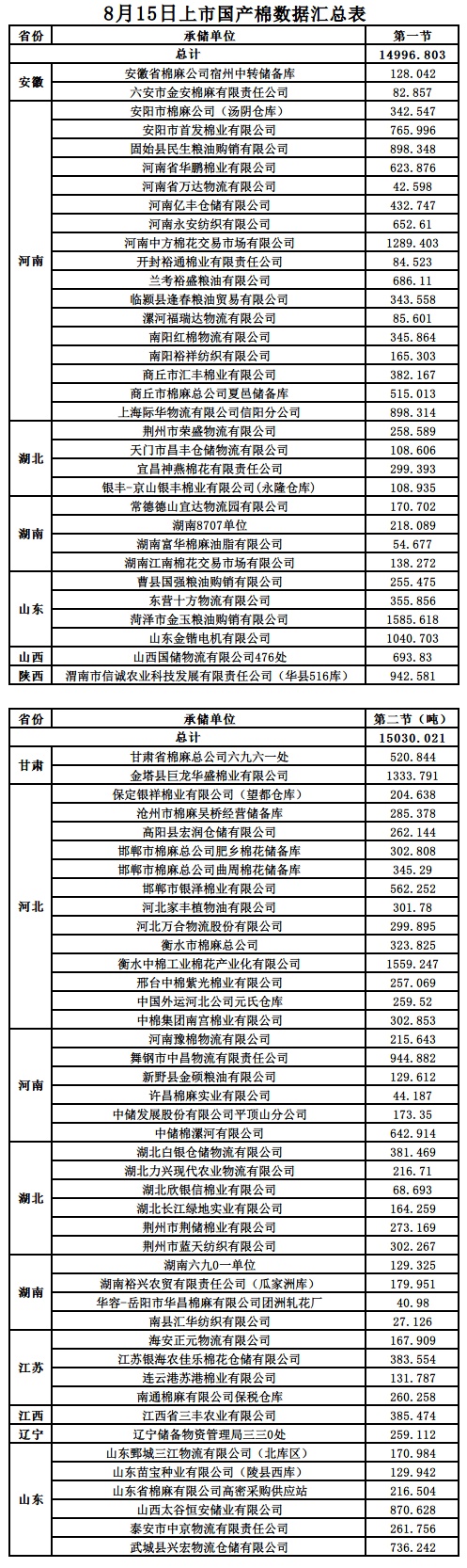 8月15日兩節(jié)共計輪出儲備棉30026.824噸。第一節(jié)計劃輪出儲備棉14996.8030噸,其中國產(chǎn)棉14996.8030噸、進口棉0噸。第二節(jié)計劃輪出儲備棉15030.0210噸,其中國產(chǎn)棉15030.0210噸、進口棉0噸。