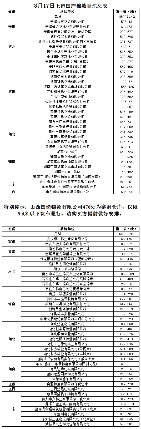 8月17日兩節(jié)共計輪出儲備棉30068.341噸。第一節(jié)計劃輪出儲備棉15007.4300噸,其中國產(chǎn)棉15007.4300噸、進(jìn)口棉0噸。第二節(jié)計劃輪出儲備棉15060.9110噸,其中國產(chǎn)棉15060.9110噸、進(jìn)口棉0噸。